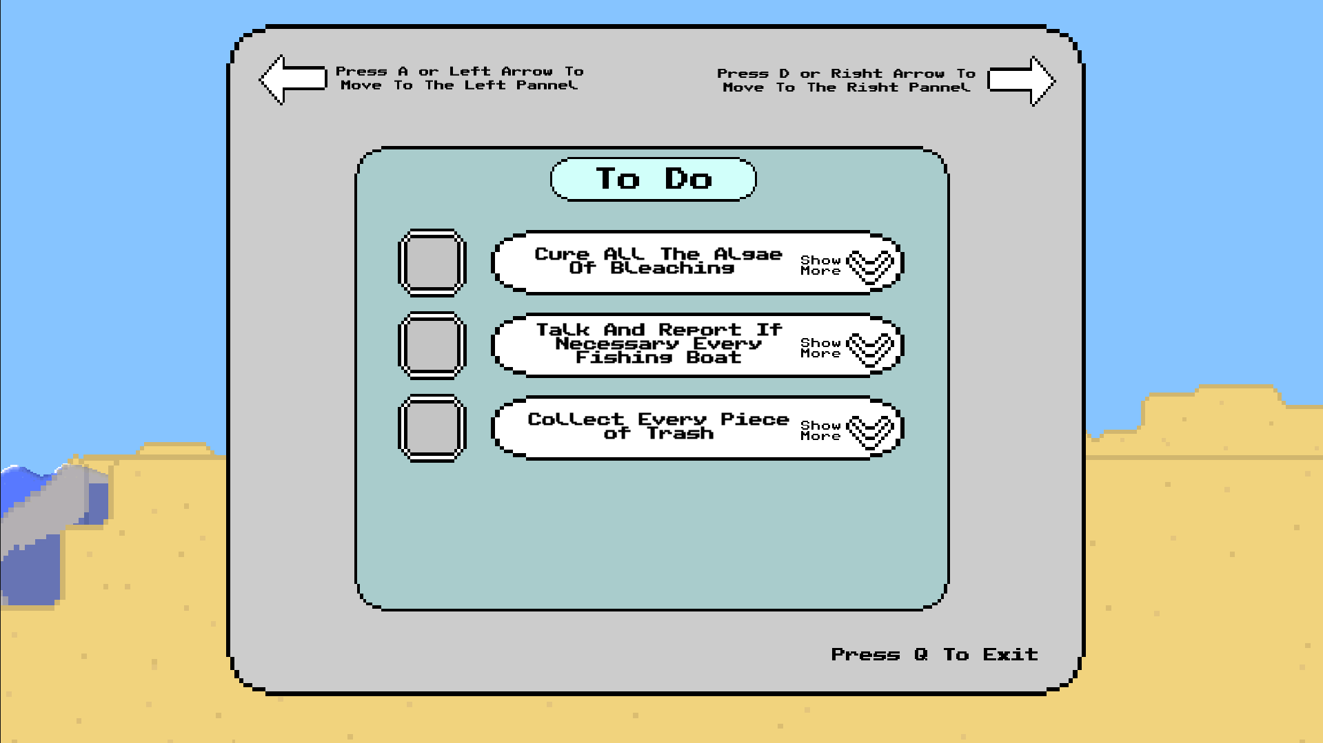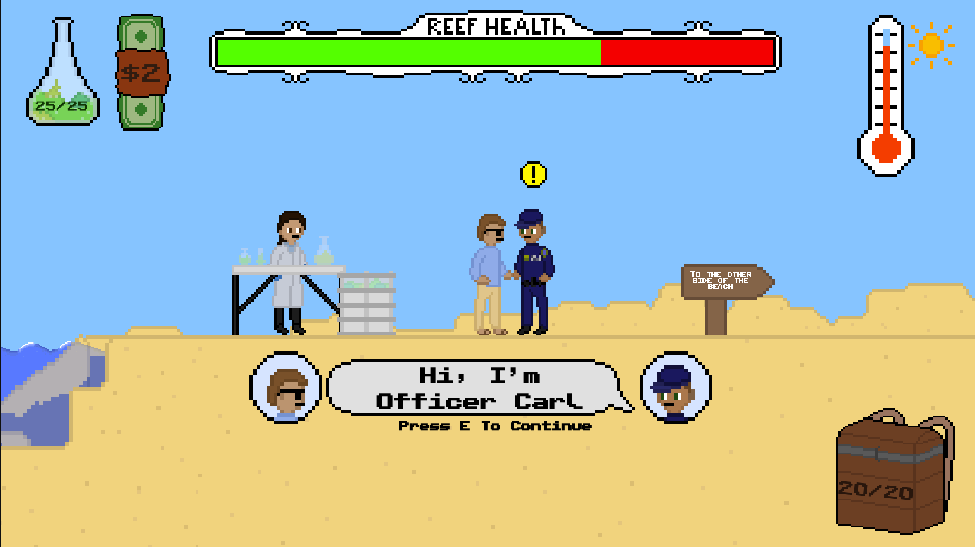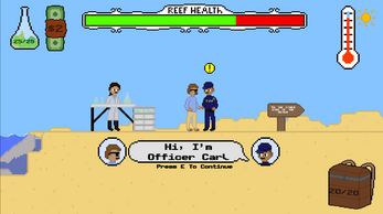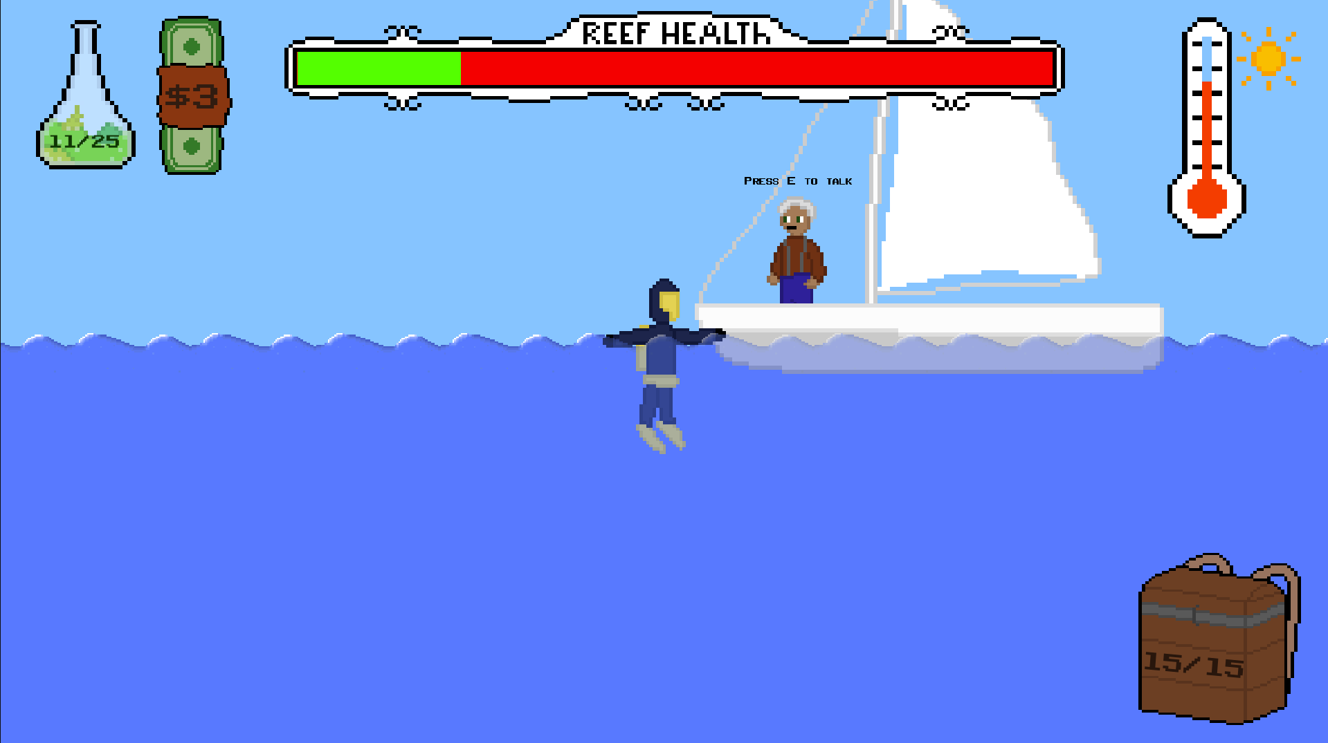 Reef Rescue is a 2D pixel art side-view game. You can walk on land and swim in water. The goal is to clean up the reef by picking up trash, reporting fishing boats, and saving bleached coral. There are NPCs that can help you save the reef. You can sell trash and buy upgrades from the fisherman, report boats to the police, and get cooling algae from a marine biologist. Unfortunately, the reef is always getting worse. More fishing boats come, trash keeps getting dumped and the coral keeps bleaching, but if you keep at it and fix the reef up fully you win.